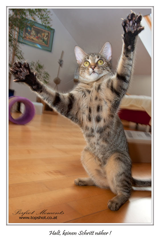 Das Alles passiert in wenigen Zehntelsekunden - so gesehen ist das Herrchen ja nicht allzu schlecht mit seiner Reaktionszeit. Auch dafür, dass er am Wochenende oft stundenlang am Boden herumliegt, nur um mir durch den Sucher seiner Kamera direkt in die Augen blicken zu können, gebührt ihm ein "grosses Lob". Das wichtigste ist aber natürlich, dass er pünktlich mein Essen serviert :-)