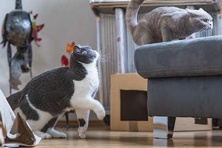 Nun denn - hier mal die "flying Lilly" in der Soft-Version. Hier hat sie sich von hinten an die nichtsahnende Ivy herangepirscht. Als sie diese dann vorsichtig beschnuppert hat, hat sich Ivy plötzlich umgedreht und die Pfote gehoben. Noch beim Erheben ihrer linken Pfote ist die "tapfere Lilly" plötzlich wie eine Rakete in die Luft geschossen ....